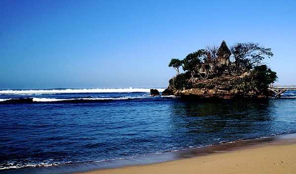 Pantai ini memiliki pura di atas pulau karang sama seperti Tanah Lot di Bali. Bedanya, pura di sini berukuran lebih kecil dan memang sengaja dibangun pada tahun 1985 oleh bupati Malang mengikuti desain Pura Tanah Lot. Mengikuti tempat wisata di Bali tersebut bukan berarti pantai ini tak menarik. Pura yang dihubungkan dengan jembatan beton sepanjang 100 meter ini terlihat cantik terutama pada saat senja.